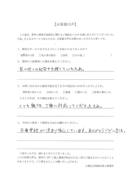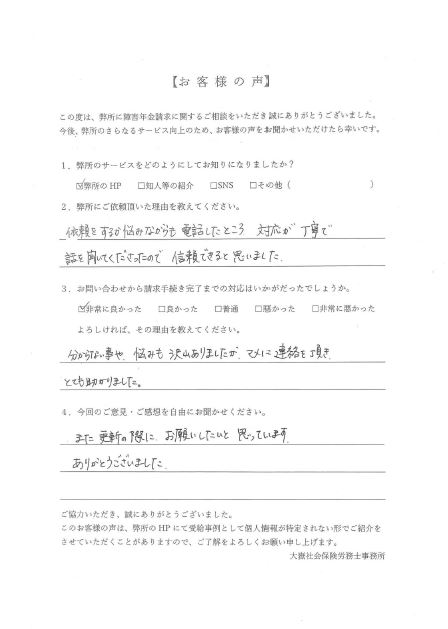 障害年金の請求は、誰でも不安な事が多いものだと思いますが、大嶽先生に頼めたおかげで安心でき、無事受給する事ができました。また機会がありましたら、是非よろしくお願い致します。