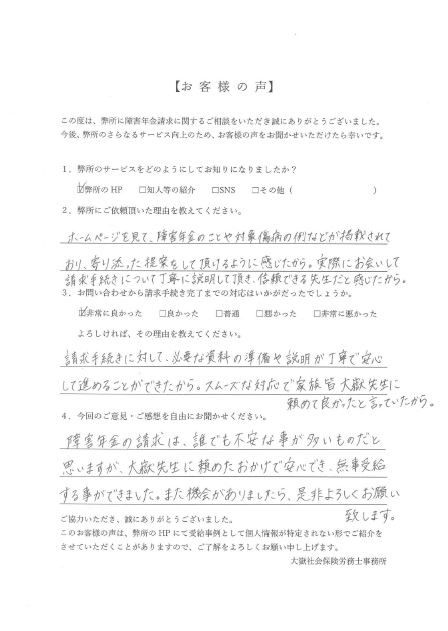 弊所に障害年金の請求サポートをご依頼いただいたお客様の声を一部ご紹介いたします。